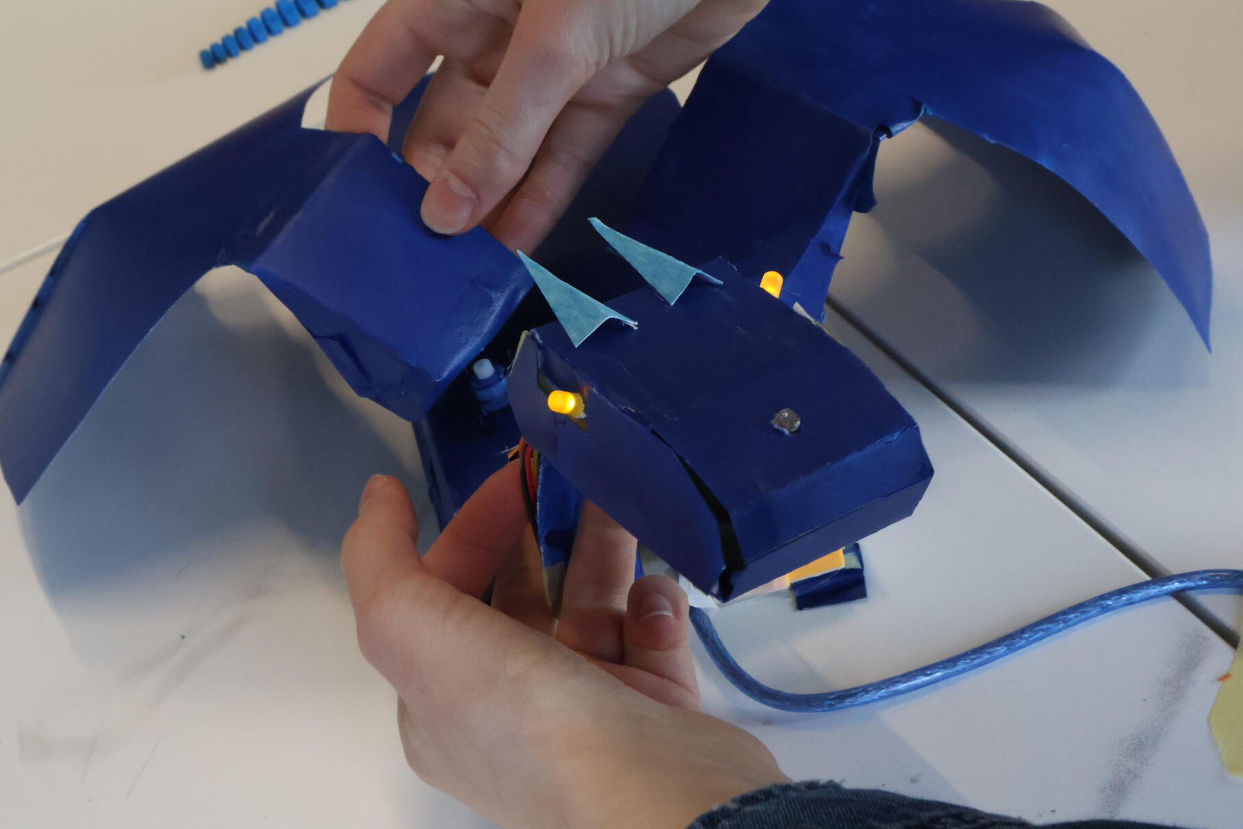 I was involved in every aspect of the process. From coding to crafting the shape of the wings.As I was one of two people who had previous experience with Arduino I was mostly working on the wiring and code.